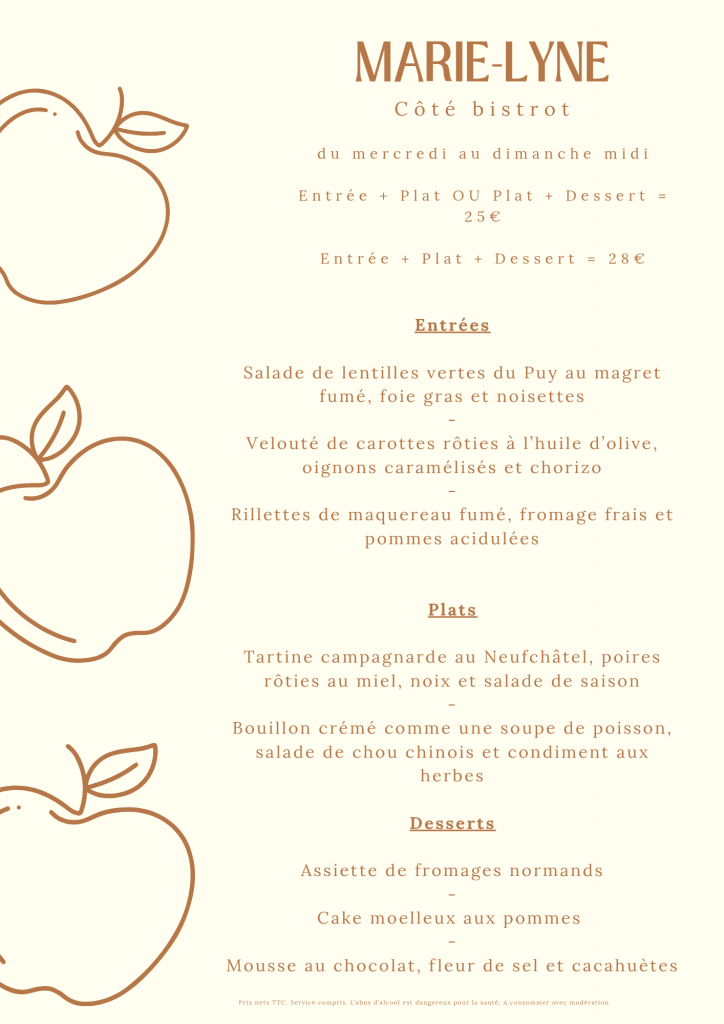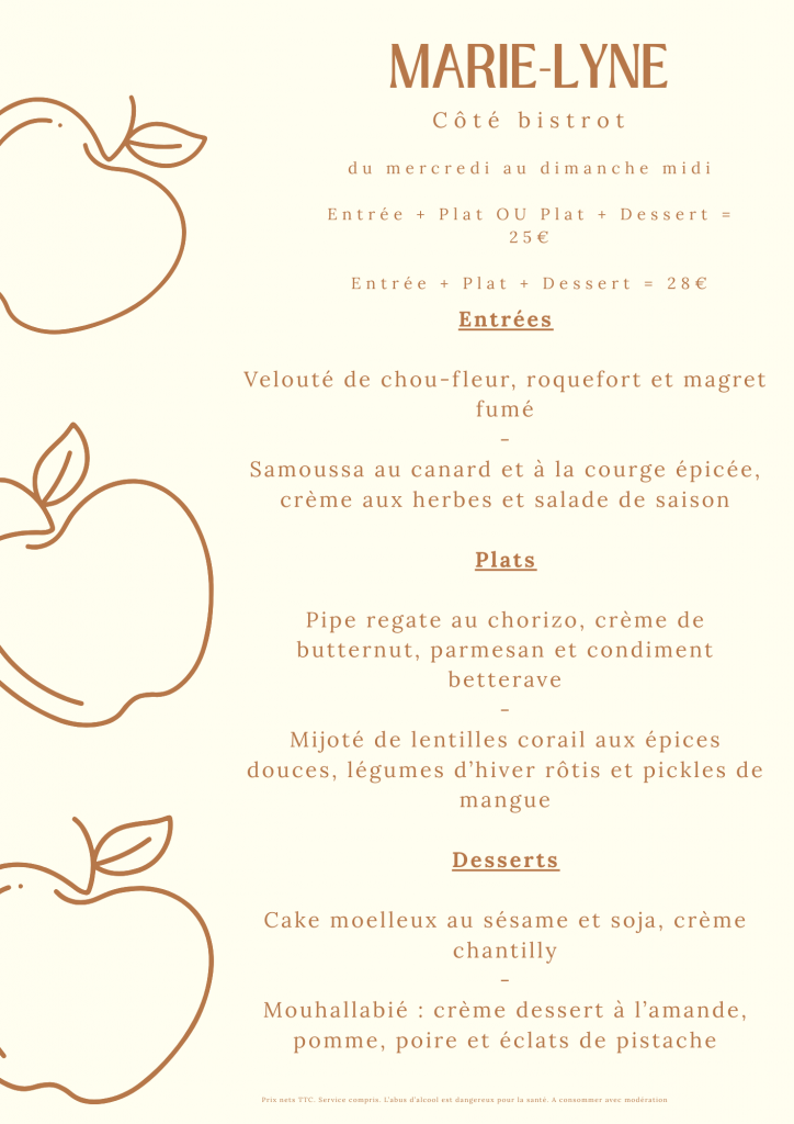 Chez Marie-Lyne, on privilégie des recettes sincères et généreuses, cuisinées maison à partir de produits bruts et locaux, qui évoluent au rythme des envies et des saisons.